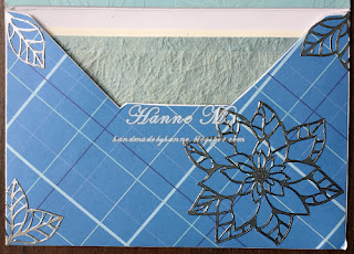 Tämän taskun sisältä löytyy myös pieni tervehdys. Kuviopaperi on samaa kuin kirjekuoressa, lisukkeena valkoista ääriviivatarraa, pitsipaperia sekä Fiskarsin leimasimella leimattu teksti.
